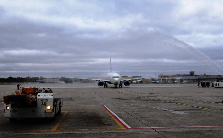 With the honor befitting this decorated war veteran, a water canon salute was sent arching over the arriving Delta flight. Delta, along with its own Honor Guard made up of fellow Veterans, performed the Honor Transfer between flights.